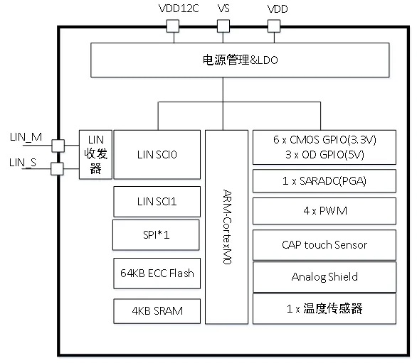- 2个LIN接口支持主和从节点,其中一路集成收发器